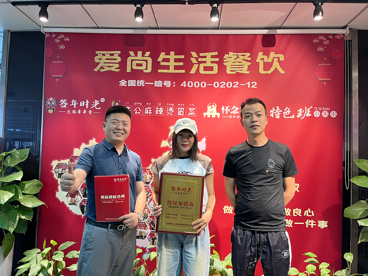 成都爱尚生活餐饮管理有限公司是一家餐饮、连锁加盟、 物流配送、产品研发与一体的大型性餐饮企业。截止现在,全球拥有签年时光品牌串串香加盟门店600+家。成为广大食客喜爱光顾的网红餐饮品牌,在全国掀起一股签年时光火锅串串香的时尚潮流。