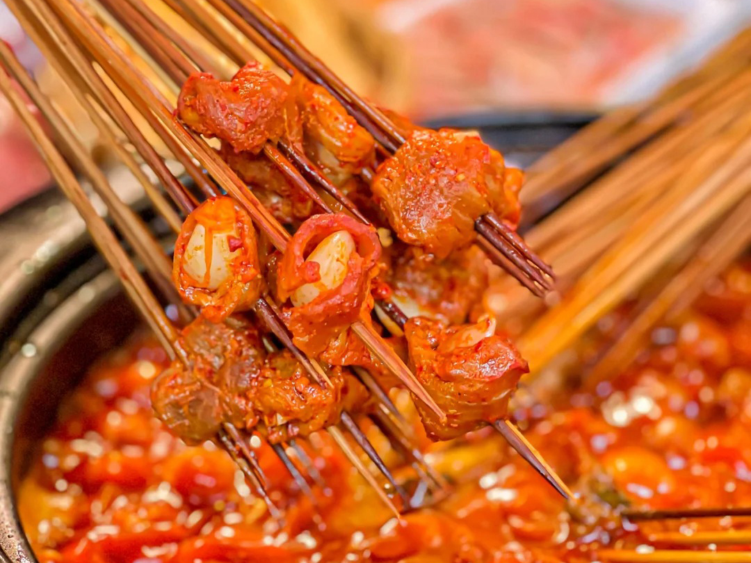 除了常规串串,签年时光还有不少 “独一份” 的创意菜,这也是它能跟竞品拉开差距的关键。比如卖得超火的 “贡菜牛肉卷”,把爽脆的贡菜切成段,裹在鲜嫩的牛肉里串起来,煮好后一口咬下去,贡菜的 “咯吱” 脆和牛肉的软嫩在嘴里碰撞,鲜辣中带着一丝清爽,很多顾客专门为这串来店。还有餐后甜品 “红糖糍粑”,不是市面上常见的 “硬邦邦” 款 —— 糯米要提前泡 6 个小时,蒸得软糯却不粘牙,炸的时候外脆里嫩,裹上现熬的红糖浆和细腻的黄豆粉,甜而不腻,吃完辣串再咬一口,解辣又解腻。不少年轻人吃完会拍照发朋友圈,无形中也帮门店做了宣传。